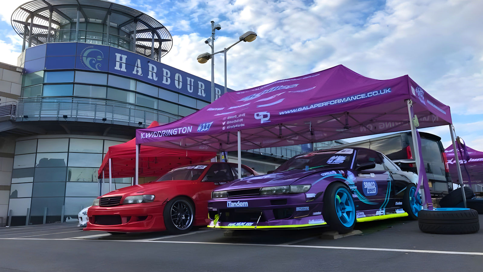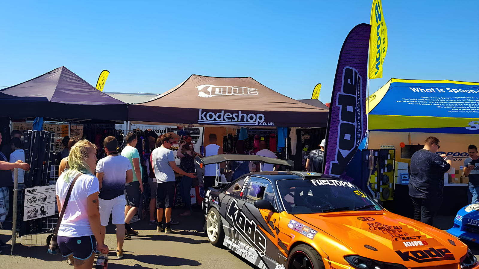 Strong brand colours in banners, tents and walling build identity and authority, but too much visual noise can be distracting. Many teams use darker tones for structure, with brighter accents and sponsor logos where they matter most.
