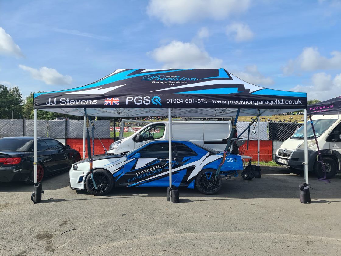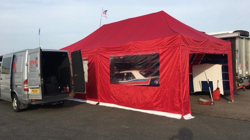 One of the largest pop up race tents available, with ample room for cars, equipment and guests